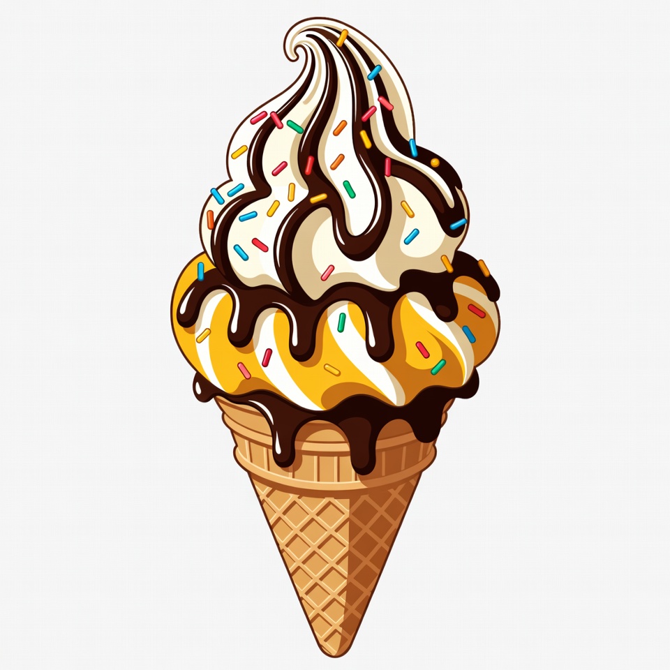 chocolate sauce, clipart, colorful sprinkles, cone, dessert, drizzled chocolate, food, frozen dessert, illustration, isolated background, soft serve, sprinkles, sweet treat, swirl, vanilla ice cream, vector, waffle cone, ice cream