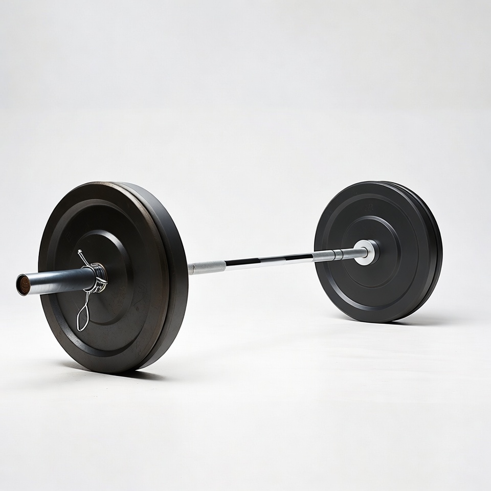 A barbell loaded with multiple black weight plates is positioned on a plain white background. The plates are secured with collars on both ends of the silver bar. The setup appears ready for weightlifting exercises.