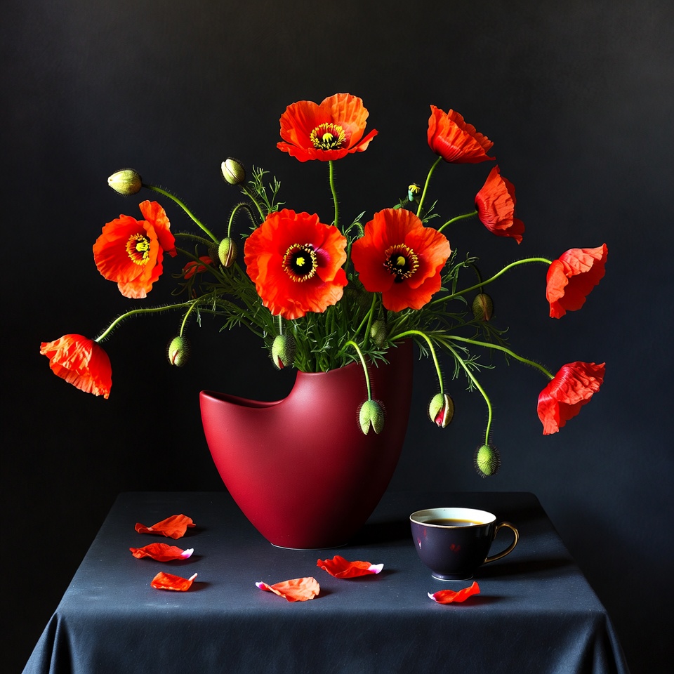 A vibrant bouquet of red poppy flowers with green stems and buds is arranged in a curved red vase. Scattered red petals surround the vase on a dark table. A green tea cup with gold rim sits nearby on a saucer.
