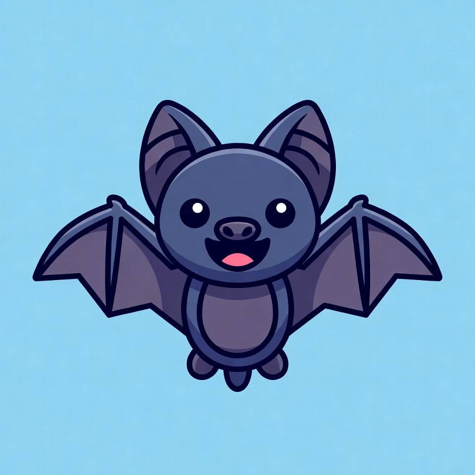 A kawaii-style cartoon bat with large sparkling eyes and a big smile flies with outstretched dark purple wings. It has pointed ears, a small pink nose, and a chubby body on a solid light blue background. The illustration features clean lines and vibrant shading typical of clipart designs.