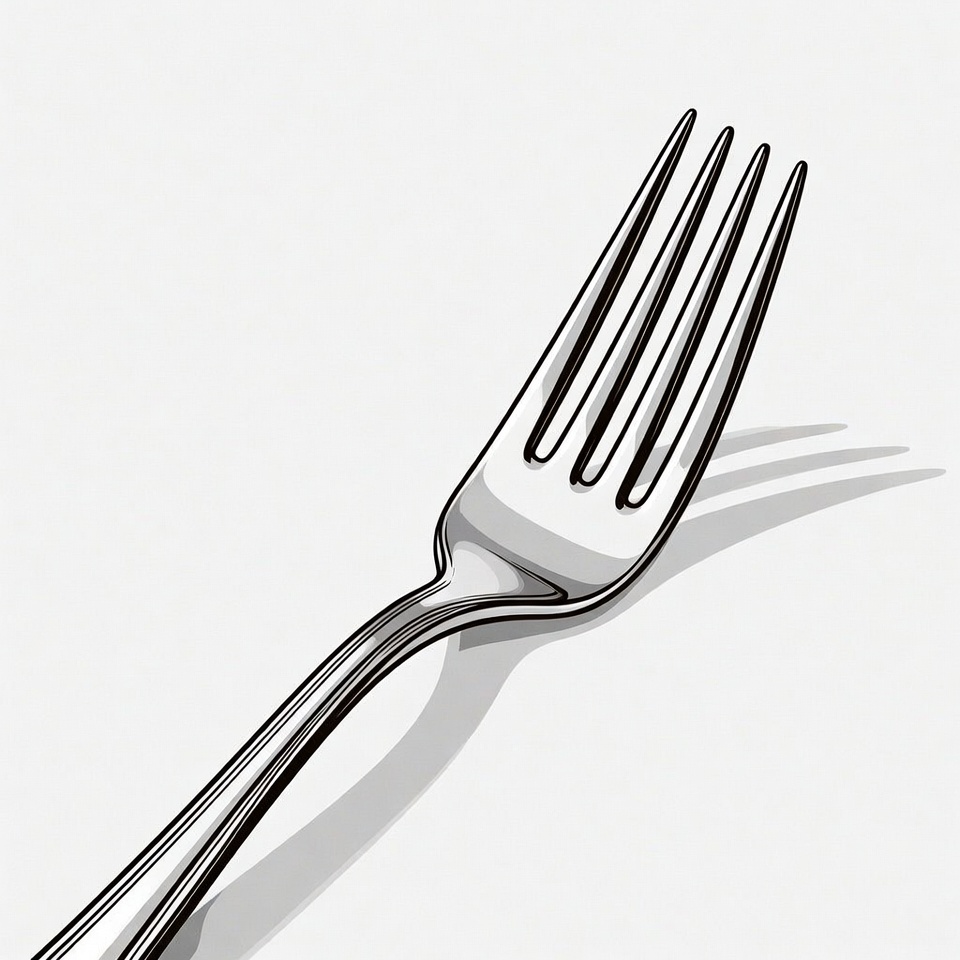 A shiny silver fork with four tines is positioned diagonally on a plain white background. It casts a subtle shadow to the right, emphasizing its metallic texture and sleek design. The illustration style features clean lines and highlights.