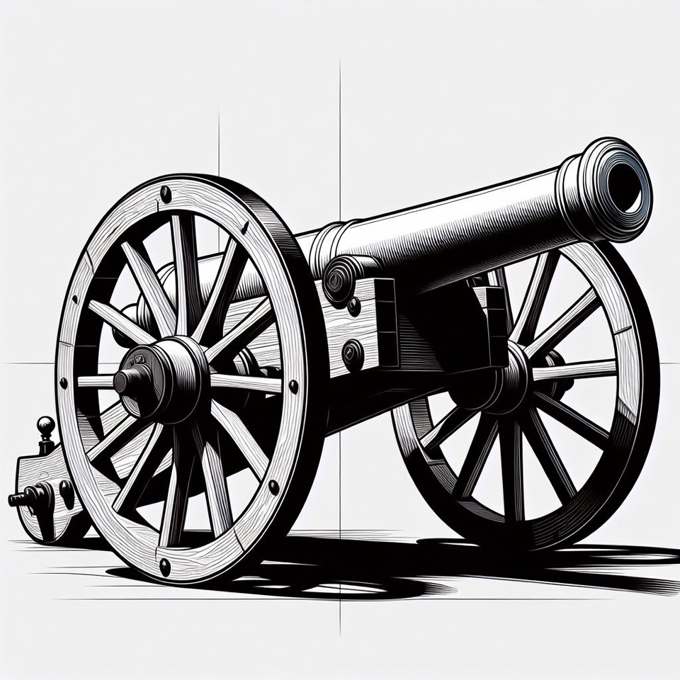 A detailed black and white illustration of a vintage cannon on wooden wheels. The cannon features a long barrel, sturdy carriage, and large spoked wheels. It is depicted with dramatic shading on an isolated white background.