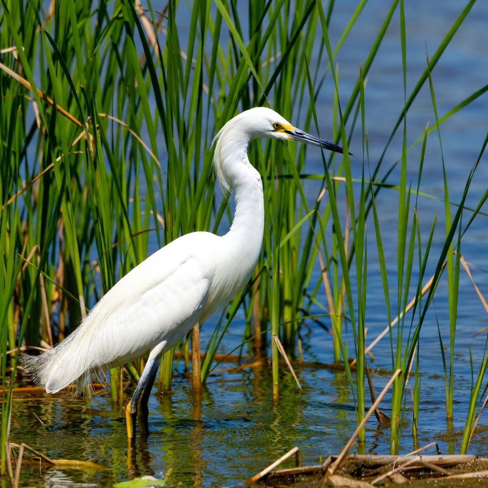 avian, bird watching, black legs, egret, feathers, green grass, habitat, heron-like, marsh, nature, plumes, reeds, shallow water, wading bird, water bird, wetland, white bird, wildlife, yellow bill, snowy egret