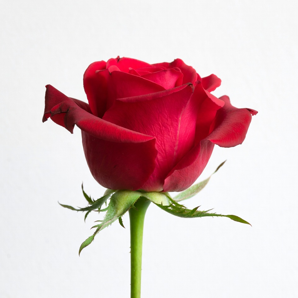 bloom, botany, closeup, floral, flower, flowers, garden, green stem, isolated, leaves, nature, petals, romantic, rose, thorns, valentine, white background, red rose