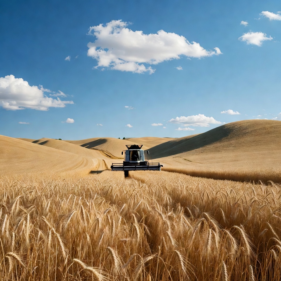 agriculture, blue sky, clouds, crop harvesting, crops, farm machinery, farming equipment, farmland, field, field work, golden wheat, grain, harvest season, harvesting, header, landscape, machinery, outdoor, rolling hills, rural, stubble, sunny day, tractor, wheat field, wheat harvest, combine harvester