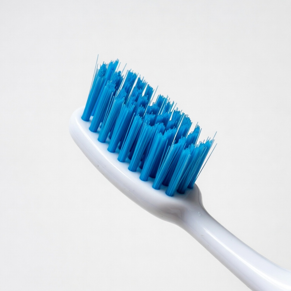 A close-up view of a blue-bristled toothbrush with a white handle, angled slightly. The bristles are dense and straight, prominently displayed against a plain white background. The toothbrush is isolated with no other objects visible.