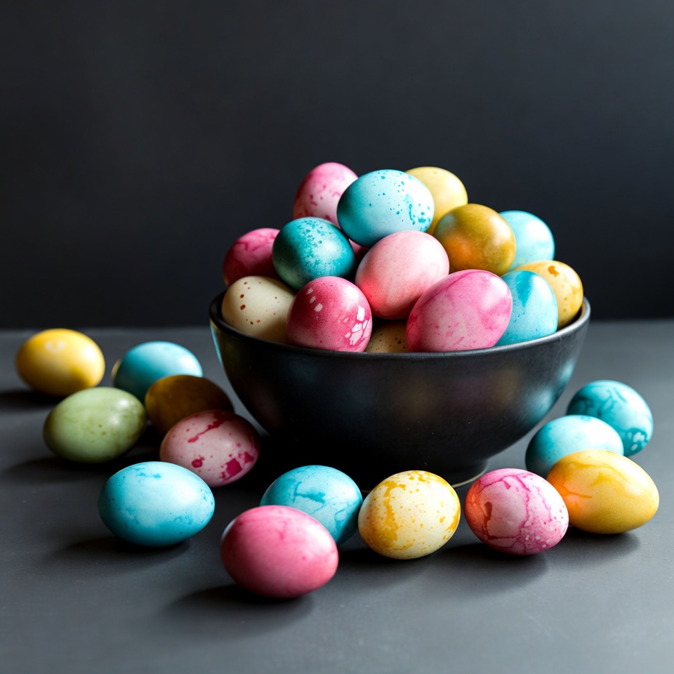A black bowl overflows with vibrantly dyed Easter eggs in shades of pink, blue, yellow, teal, and gold. Some eggs spill out onto the dark gray surface surrounding the bowl. The eggs feature marbled and speckled patterns.
