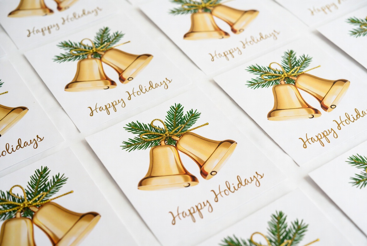 Multiple white greeting cards arranged in a grid feature gold bells and green fir branches. Each card displays elegant 'Happy Holidays' text in gold script. The holiday design elements are illustrated with detailed watercolor-style graphics.