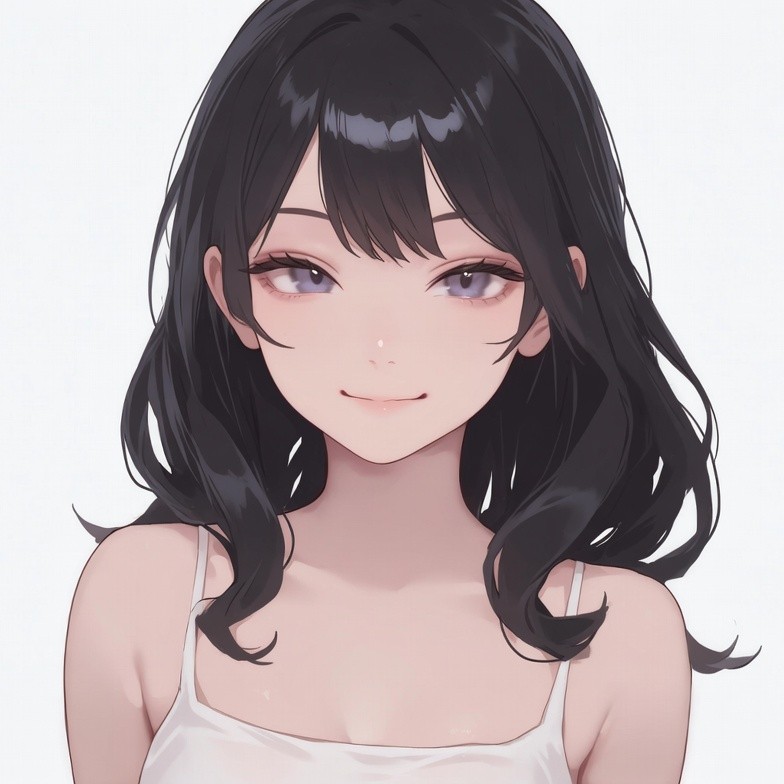 A beautiful anime girl with long black hair and purple eyes smiles softly at the viewer. She wears a white camisole top that reveals her shoulders and has a gentle blush on her cheeks. The illustration features a clean white background with detailed shading.