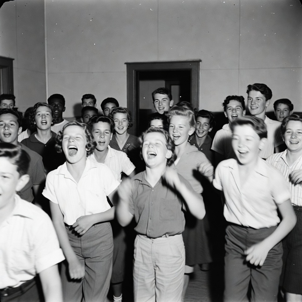 A large group of children stands in a gymnasium, laughing with open mouths and raised arms as if dancing joyfully. They wear 1950s-style school uniforms including short-sleeved shirts, skirts, and shorts. The black and white photo shows them gathered in front of a wooden door on a plain indoor background.