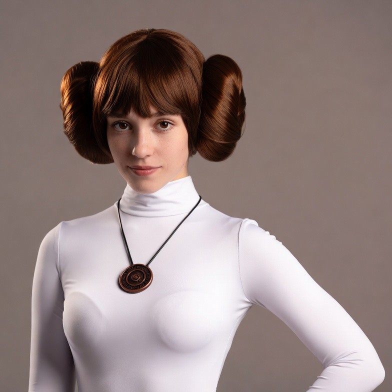 Leia buns, Star Wars, brown hair, cosplay, costume, female, gray background, hairstyle, isolated background, pendant necklace, portrait, side buns, white turtleneck, wig, woman, young woman, Princess Leia