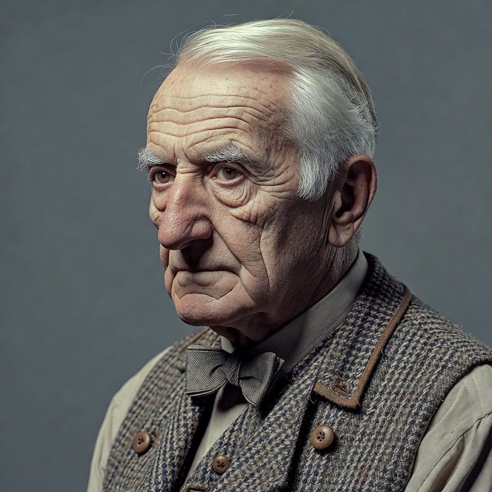 White, bow tie, closeup, furrowed brows, gray background, leather trim, old man, portrait, senior, serious expression, shirt, tweed vest, vest, white hair, wrinkled face, elderly man