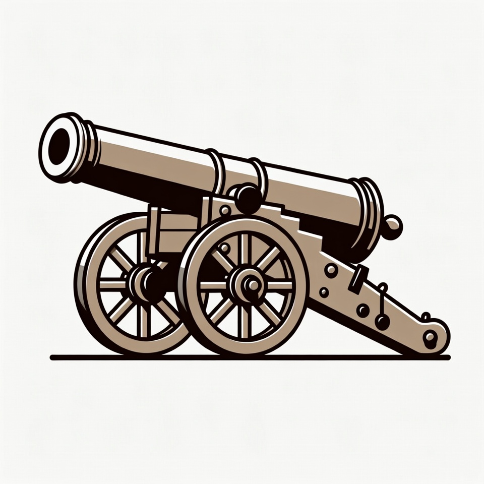 artillery, barrel, brown tones, clipart, historical cannon, illustration, isolated background, line art, metal barrel, military weapon, vector art, vintage cannon, wheels, wooden wheels, cannon