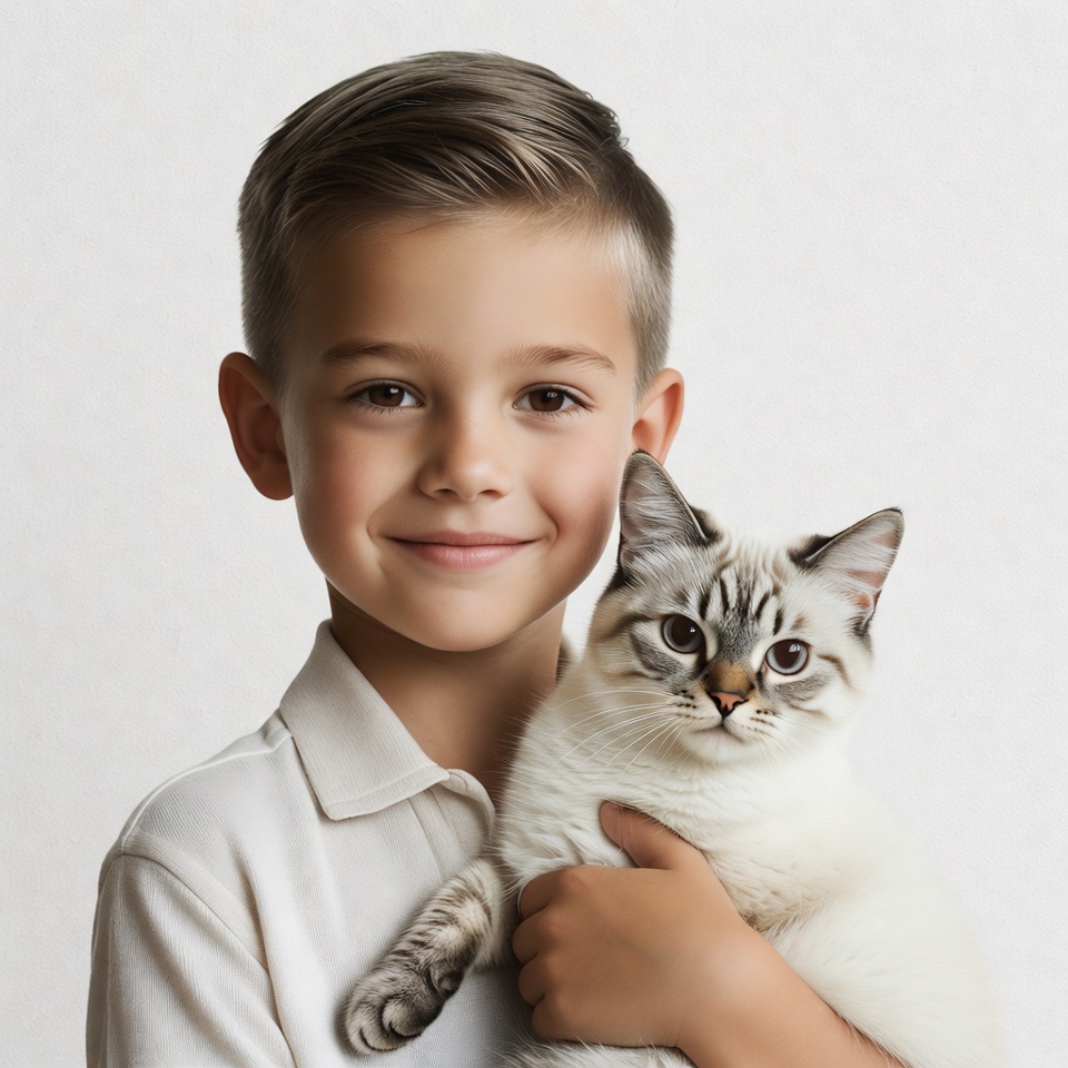 A young boy with short light brown hair smiles while holding a fluffy white kitten with tabby markings. He wears a light-colored collared shirt and stands against a plain white background. The kitten looks at the camera with its paws gently held by the boy.