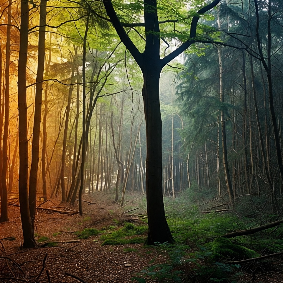 autumn woods, birch trees, blue tones, central tree, colorful trees, dense woods, fall foliage, fallen leaves, ferns, forest floor, forest scenery, green trees, magical forest, misty woods, nature landscape, orange leaves, pine trees, red leaves, seasonal forest, sunlight rays, tree trunks, vibrant colors, woodland path, yellow leaves, autumn forest