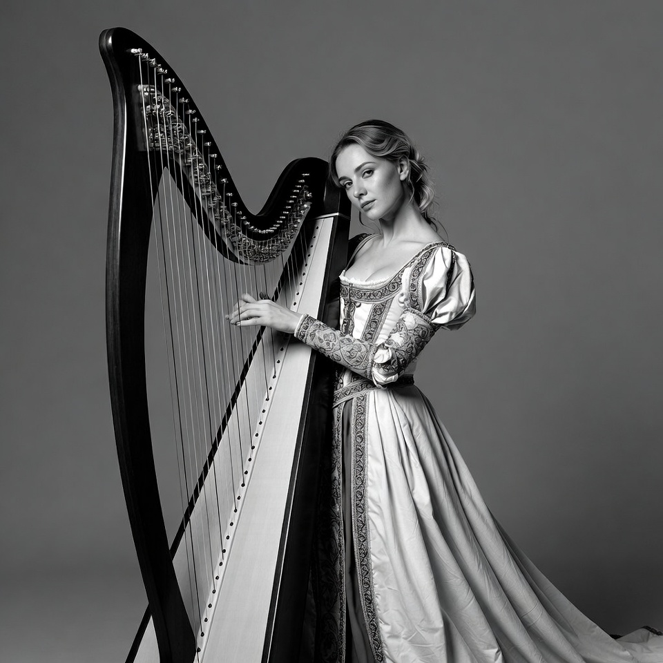 Renaissance gown, White, black and white, blonde hair, classical music, corset, elegant pose, female, formal attire, gray background, hand on harp, harp, harpist, historical dress, lace dress, monochrome photo, musical instrument, musician, playing harp, puffed sleeves, studio portrait, updo hairstyle, vintage fashion, wavy hair, woman