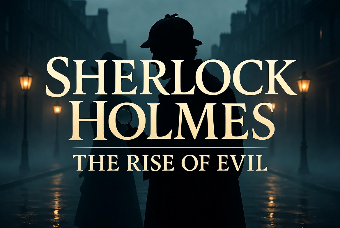 A dramatic movie poster features the silhouette of Sherlock Holmes wearing a deerstalker hat, standing on a foggy Victorian street with gas lamps and cobblestones. The text 'Sherlock Holmes The Rise of Evil' is prominently displayed in elegant golden lettering. Shadowy figures and misty atmosphere enhance the mysterious backdrop.