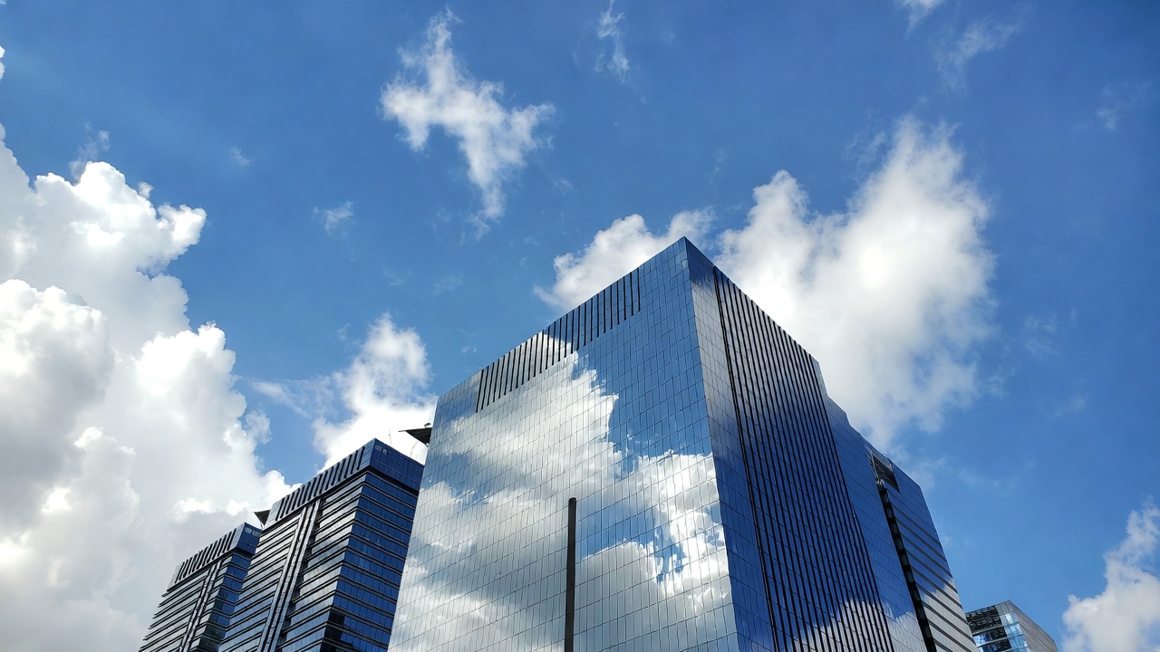 architecture, blue sky, cityscape, clouds, cloudy sky, contemporary architecture, glass facade, high-rise, low angle, mirrored glass, modern building, office tower, reflection, tall building, urban, skyscraper