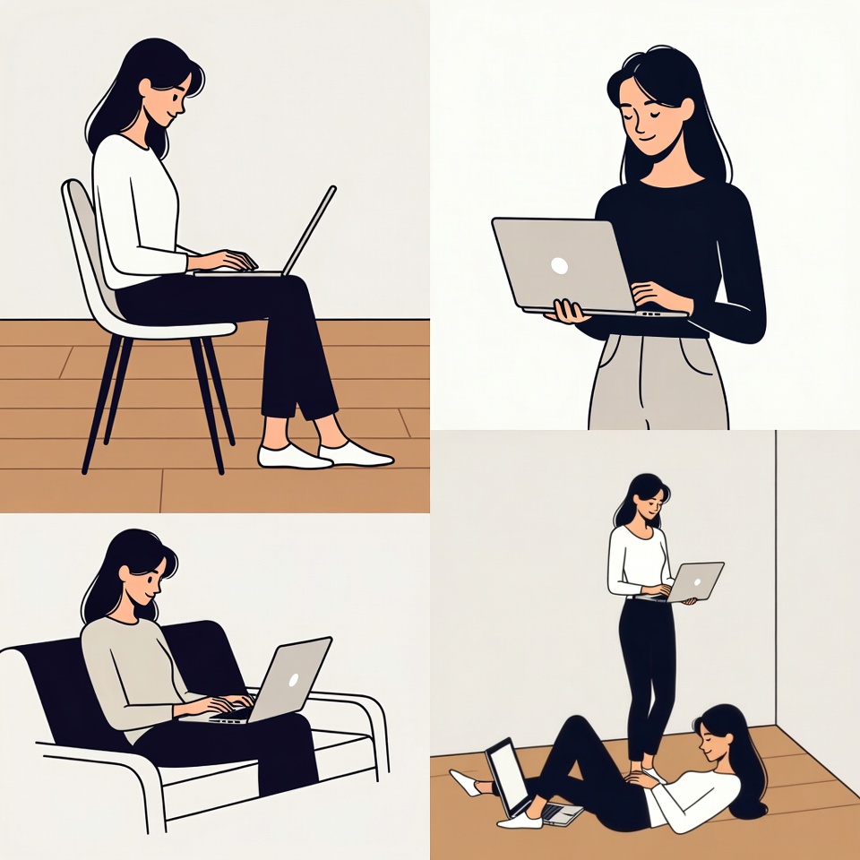 Four minimalist line art illustrations depict an Asian woman with long black hair working on a laptop in various poses and settings. She sits in a white chair typing on a silver laptop, stands holding it, sits on a gray couch using it, and lies on the floor typing. Each scene features simple backgrounds like wooden floors or plain walls, with her dressed in white tops, black pants, and white socks.
