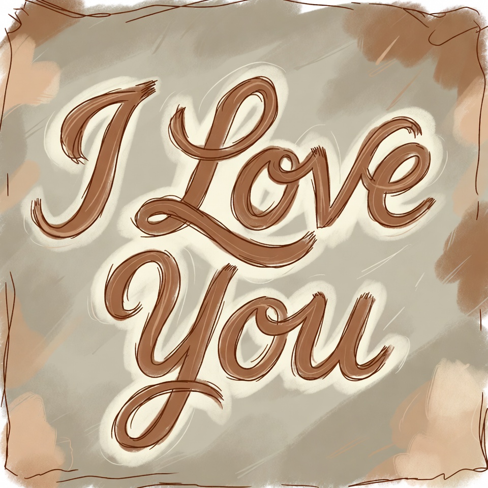 A hand-drawn illustration features the phrase 'I Love You' in elegant, flowing brown script letters. The text is centered on a textured beige background with subtle brush strokes and a rough border. The artistic style resembles watercolor or sketch art.