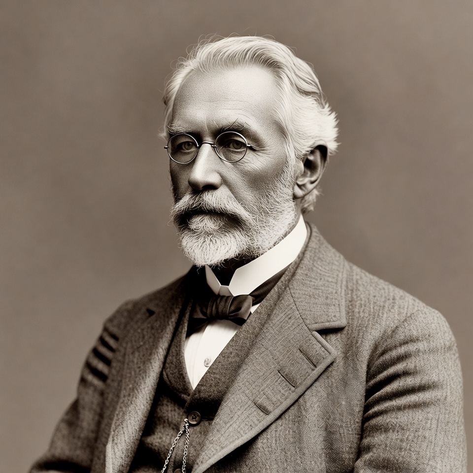 An elderly White man with white hair and a full beard wears round glasses and a formal Victorian-era suit. He has a bow tie, collared shirt, and waistcoat, posed against a plain sepia-toned background. His expression is serious as he gazes slightly to the side.
