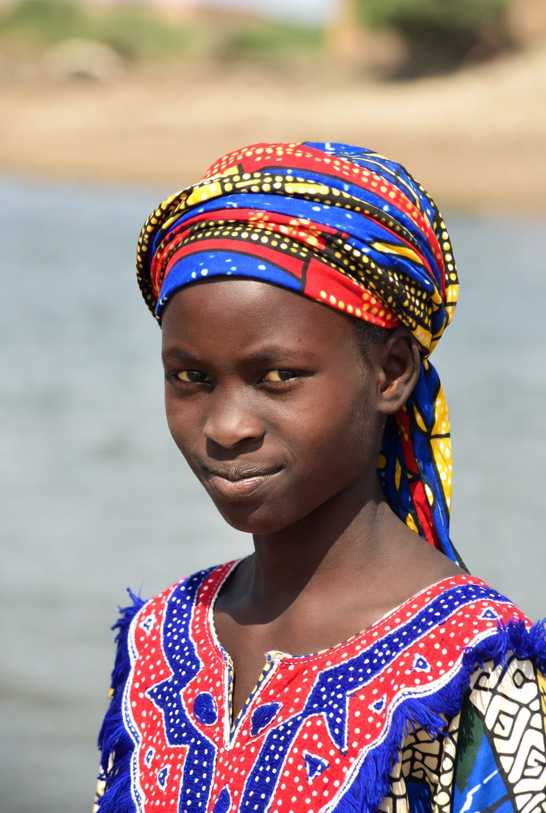 Africa, African, blue patterns, child, colorful headwrap, cultural attire, dark skin, embroidered dress, female, fringed clothing, girl, head tie, headscarf, outdoor, portrait, red dress, river background, sand, smiling slightly, traditional dress, water, yellow accents, young girl, African girl