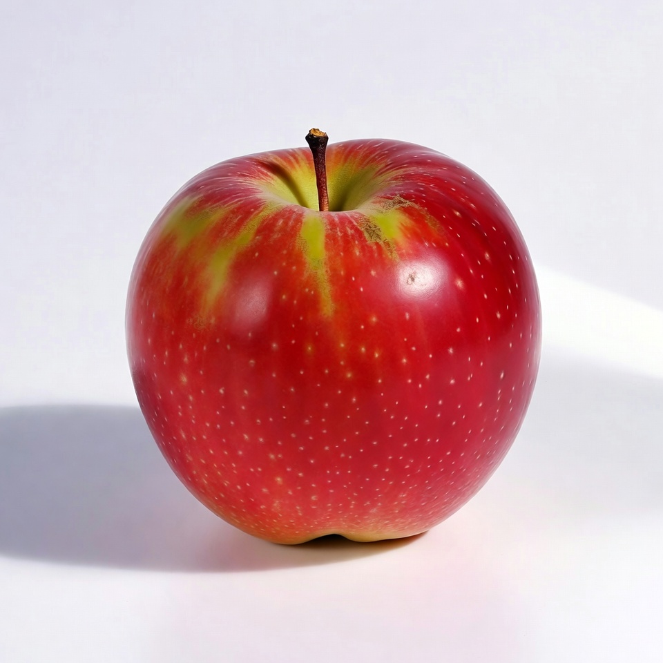 A fresh red apple with green highlights and a brown stem sits on a plain white background. The apple features a glossy surface with subtle speckles and a slight yellow tint at the base.