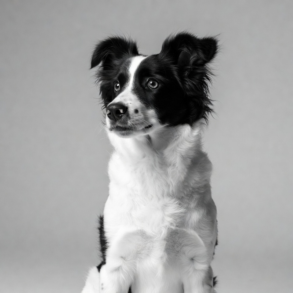 A black and white Border Collie dog sits attentively facing slightly to the side. The dog has fluffy fur with distinct black patches over white markings and expressive eyes. The image is in black and white against a plain gray background.
