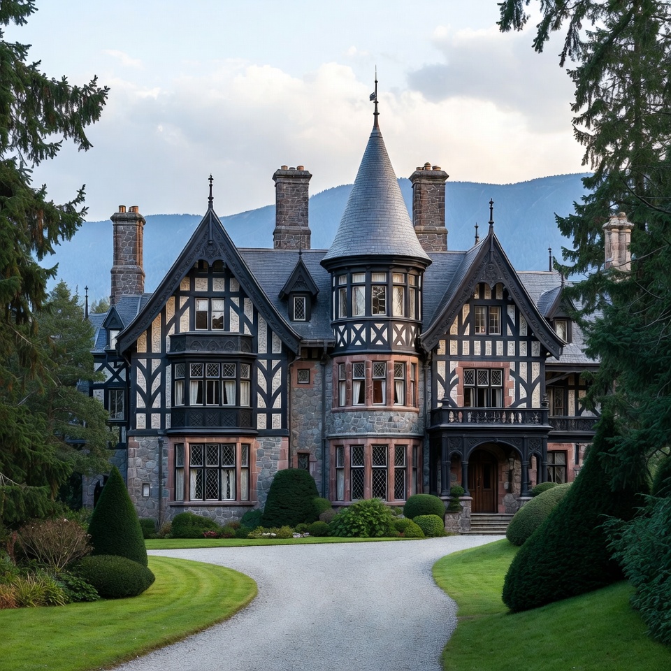 Tudor style, Victorian mansion, architecture, black white timber, castle, chateau, driveway, estate, evergreen trees, forest, gabled roof, gravel path, hedges, house, isolated background, landscape, lawn, luxury home, manor, mountains, nature, residential, turrets, mansion