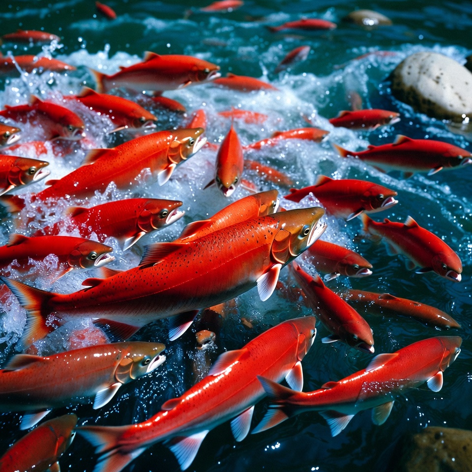 aquatic animals, blue water, current, fish, fish migration, group of fish, nature, red salmon, river, rocks, school of fish, sockeye salmon, spawning salmon, splashing water, stream, swimming, upstream, water, wildlife, salmon
