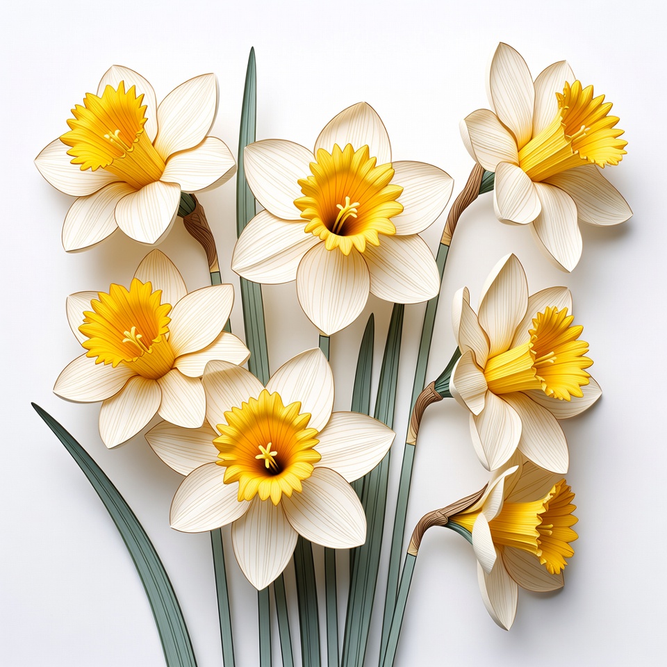 A cluster of white daffodils with bright yellow centers and green stems is arranged on a plain white background. The flowers feature delicate petals and slender leaves. They are positioned closely together, creating a vibrant spring floral display.