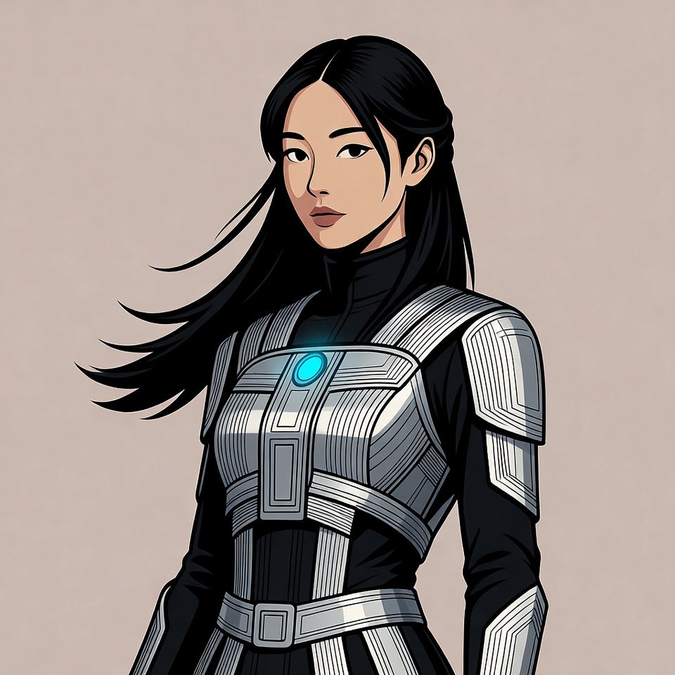 An Asian woman with long black hair stands confidently wearing detailed silver and black futuristic armor. The armor features glowing blue accents on the chest and segmented plates. She poses against a plain beige background in an anime-style illustration.