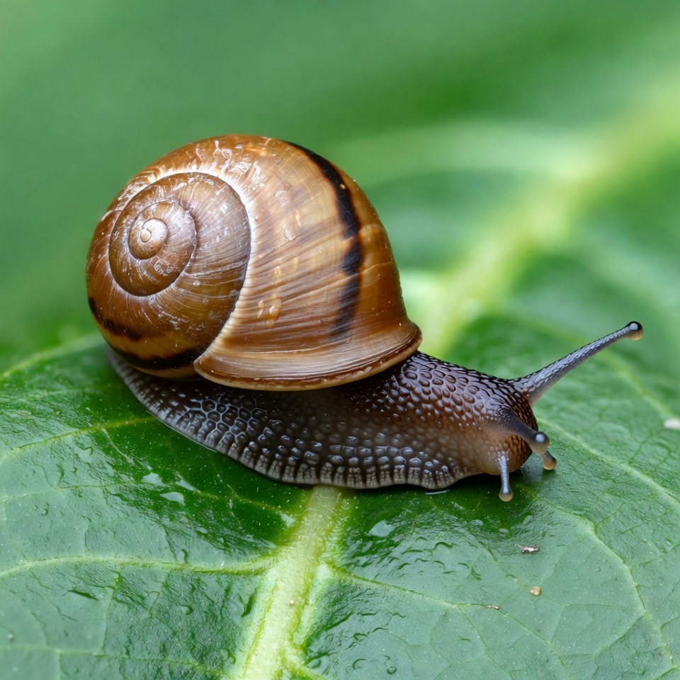 animal, brown snail, closeup, crawling, dew drops, garden snail, green leaf, invertebrate, leaf, macro, mollusk, nature, spiral shell, tentacles, wet leaf, wildlife, snail