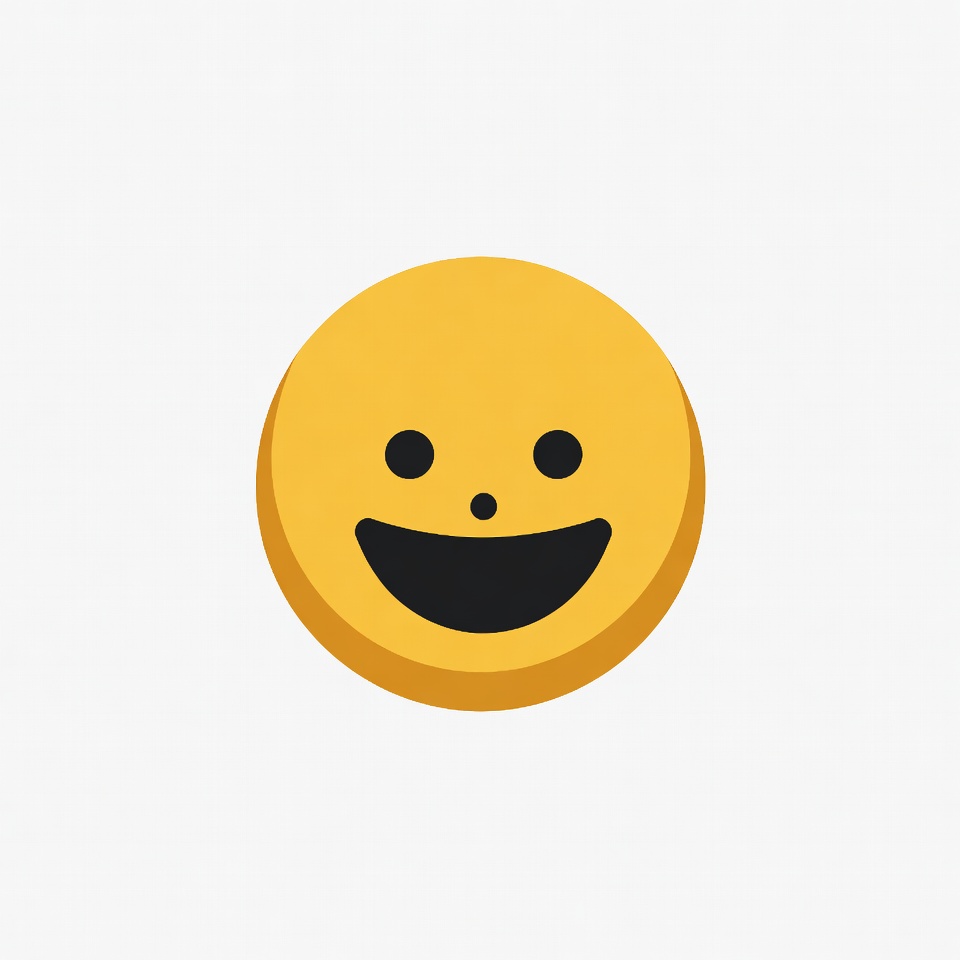 A bright yellow circular emoji face with black eyes and a wide open smiling mouth is centered on a white background. The simple illustration features a small black nose and smooth shading for a 3D effect. It conveys a cheerful expression.