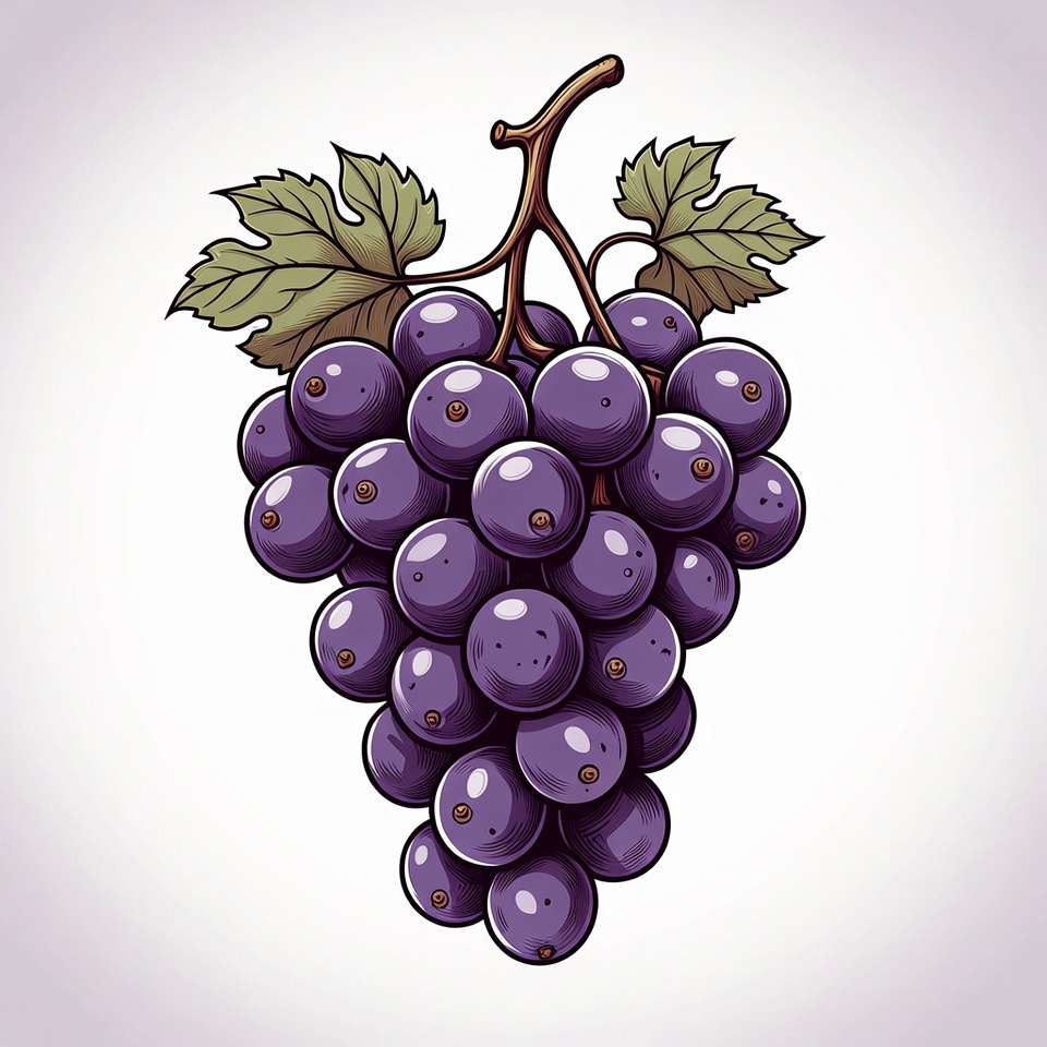 clipart, fruit, grape bunch, grape cluster, grape stem, green leaves, illustration, isolated background, purple grapes, ripe grapes, shiny grapes, vector art, vine fruit, grapes