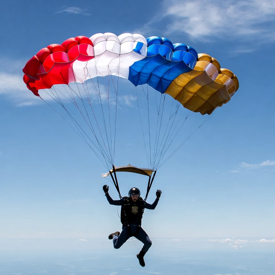 A man in a black skydiving suit and helmet descends through the sky under a large parachute featuring red, white, blue, and gold sections. His arms are outstretched and legs bent as he freefalls with the parachute fully deployed. The background shows a clear blue sky with scattered white clouds.