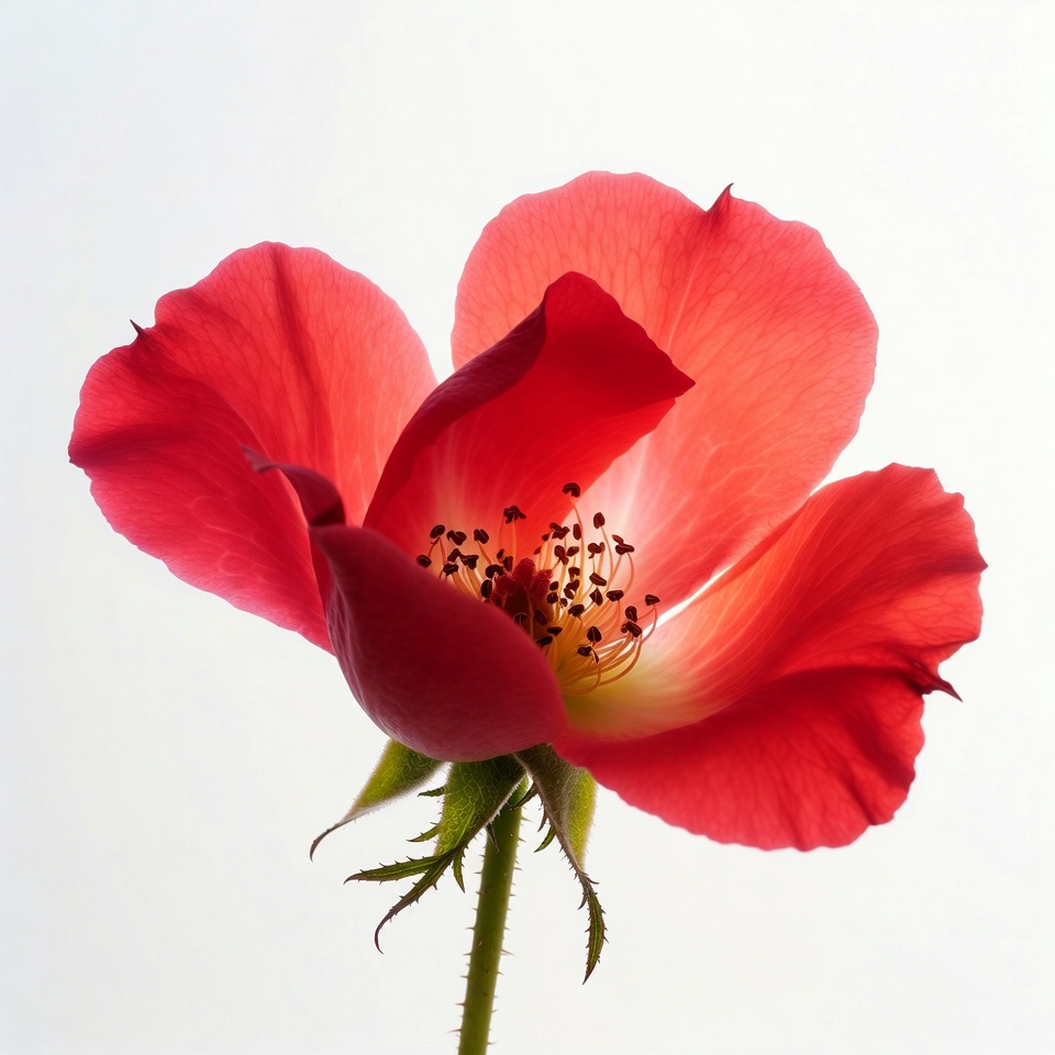 bloom, botany, closeup, floral, flower, garden flower, green stem, isolated, nature, petals, pink petals, red flower, rose flower, stamen, thorns, vibrant, white background, red rose