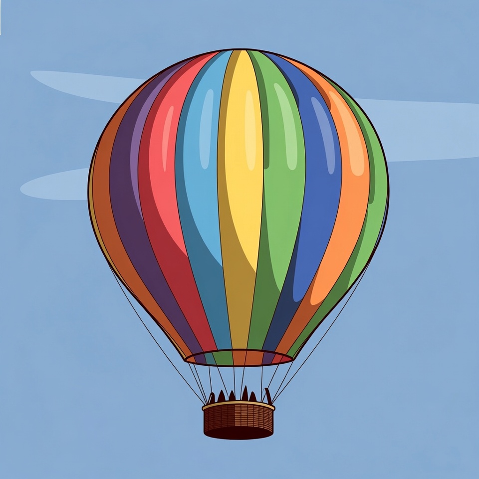 A vibrant hot air balloon with multicolored stripes in red, yellow, green, blue, and purple floats against a clear blue sky. The balloon features a brown basket hanging below with ropes attached. It is a cartoon-style illustration on an isolated background.