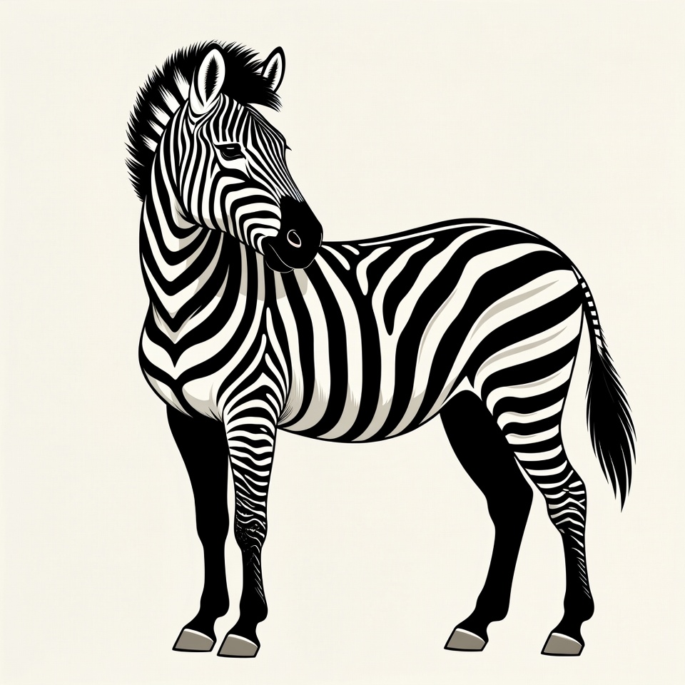 A black and white zebra stands in profile on a plain white background. The illustration features bold black stripes on a white body, with a fluffy black mane and expressive eyes. Its tail and hooves are detailed in black.