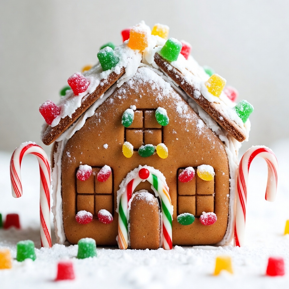 A detailed gingerbread house features brown gingerbread walls with white icing borders and roofs. It is decorated with multicolored candies, green and yellow gumdrops on the roof, and red and green candies around the windows and door. Two large red and white candy canes stand beside it on a snowy white base scattered with candy pieces.