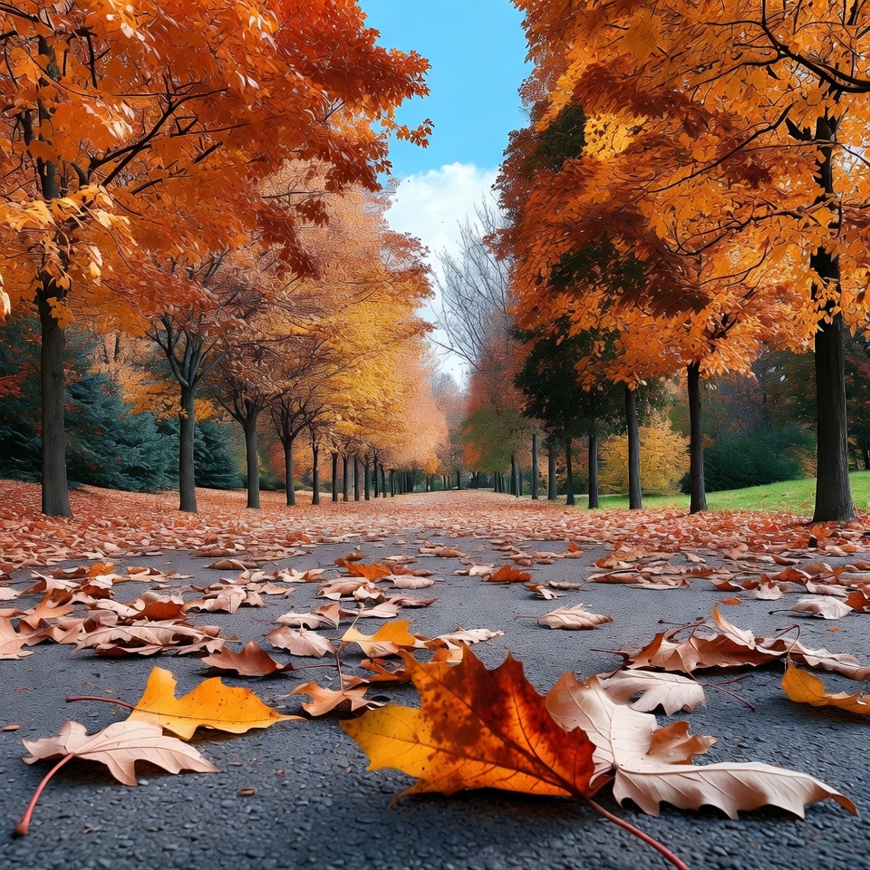 alley, asphalt, autumnal, avenue, blue sky, clouds, fall, fall colors, foliage, forest path, golden leaves, landscape, leaf covered, leaves, nature, orange leaves, park, path, pathway, red leaves, road, season, trail, trees, vibrant, woods, yellow leaves, autumn