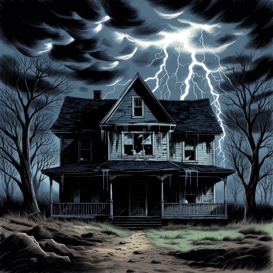 A dark, dilapidated haunted house stands amid barren trees during a stormy night. Bright lightning bolts illuminate the sky and strike around the gothic structure with broken windows and sagging porch. A winding path leads through rocky grass to the eerie front door.