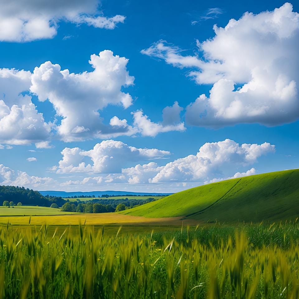 blue sky, bright sky, clouds, countryside, farmland, fields, fluffy clouds, grass, green fields, green grass, green hills, hills, landscape, nature, outdoors, pastoral landscape, rural scenery, scenic view, sky, summer landscape, sunny day, wheat field, wheat grass, white clouds, rolling hills