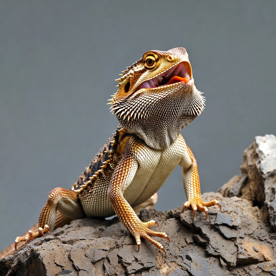 animal, exotic pet, gray background, isolated, lizard, open mouth, orange scales, pet lizard, pink tongue, reptile, rock, spiky beard, bearded dragon
