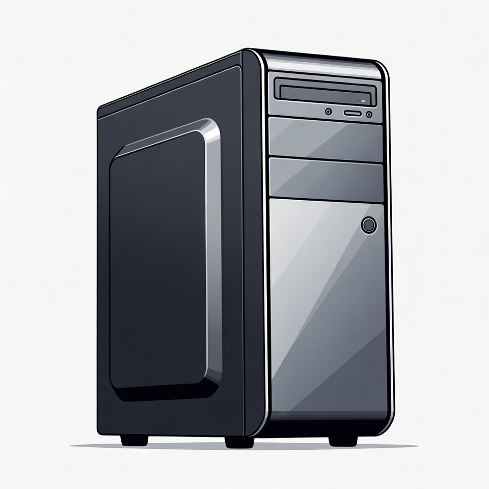 CD drive, PC tower, black computer, clipart, computer case, desktop computer, gaming PC, hardware, illustration, isolated background, silver accents, technology, tower PC, computer