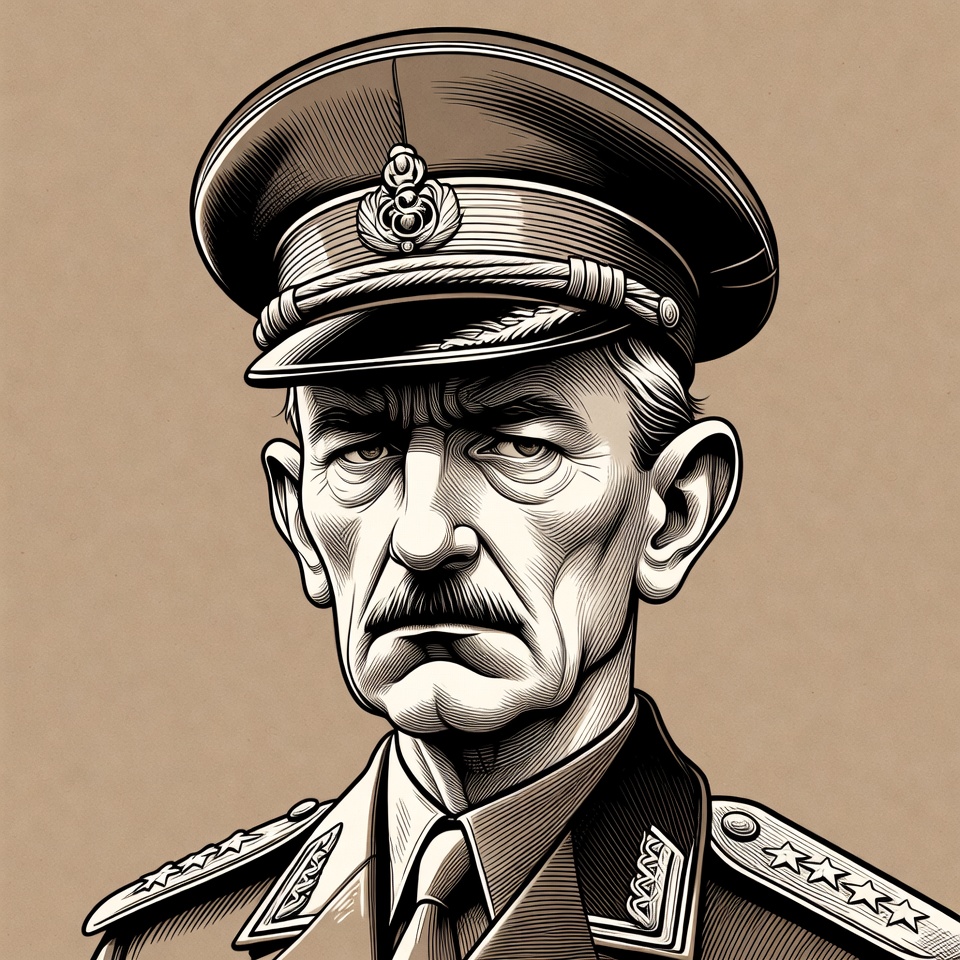 A stern older man with a mustache wears a military uniform and peaked cap adorned with insignia. The detailed line art illustration features sharp facial features and exaggerated cheekbones on a beige background. He gazes directly forward with narrowed eyes.