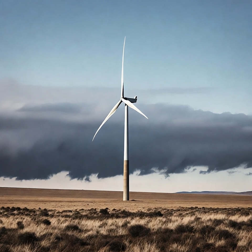 A tall white wind turbine stands in a vast open field of dry grass and bushes. Dark clouds fill the sky above, contrasting with the clear horizon. The turbine's blades are positioned at an angle against the cloudy backdrop.
