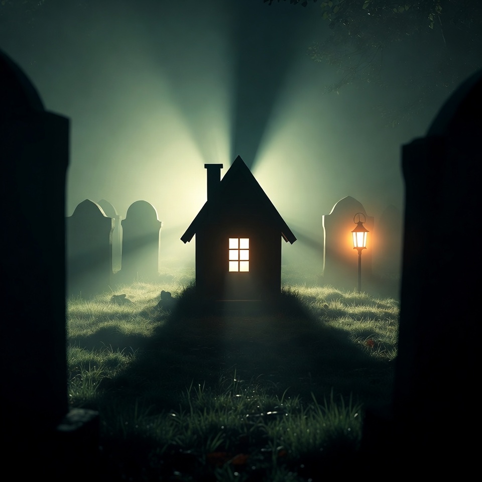 A tiny house with lit windows emits a bright glow amidst tall gravestones in a foggy cemetery at night. An old lantern casts warm light nearby, and mist covers the grassy ground. The scene features dramatic lighting and silhouettes of surrounding tombs.