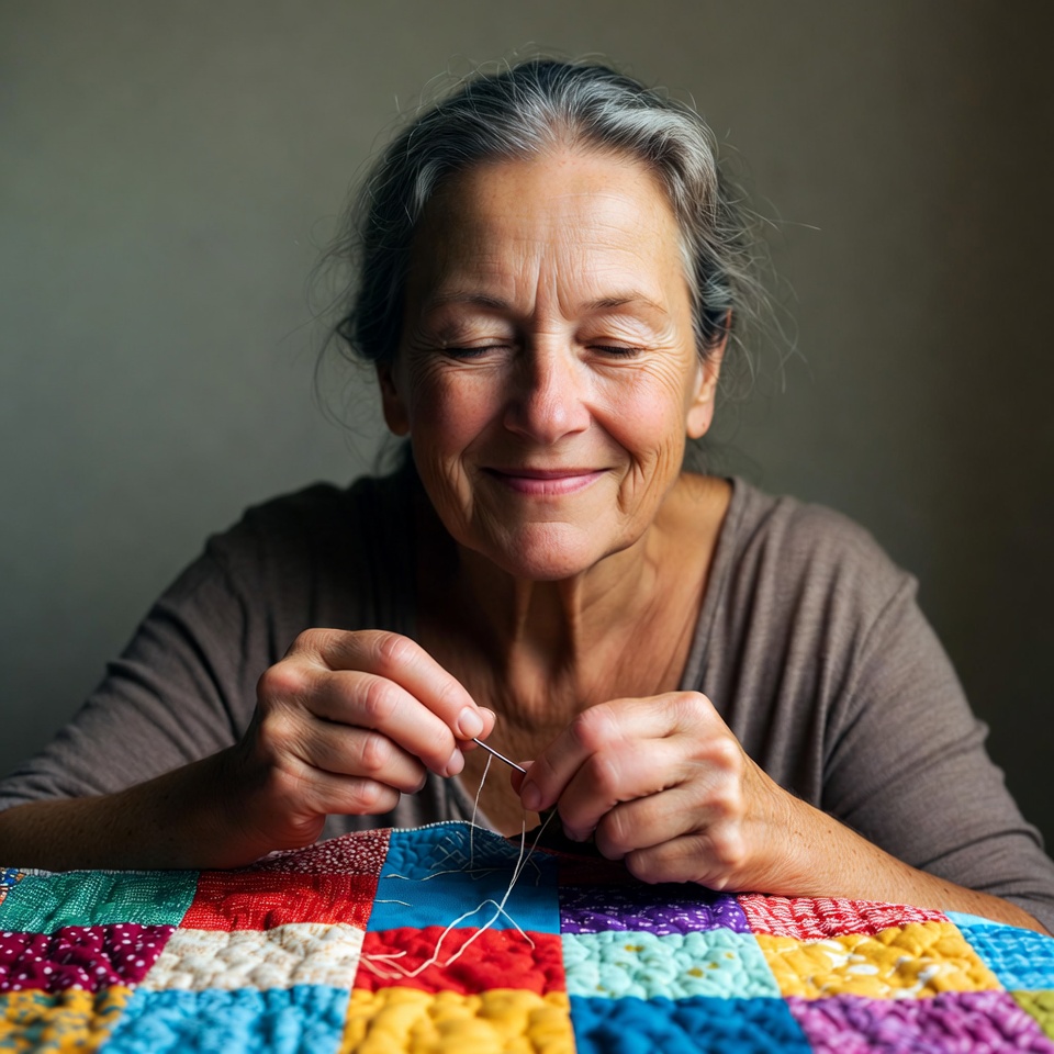 An elderly woman with gray hair smiles while sewing on a vibrant patchwork quilt. She wears a brown top and holds a needle and thread close to her face. The quilt features multicolored fabric squares in various patterns.