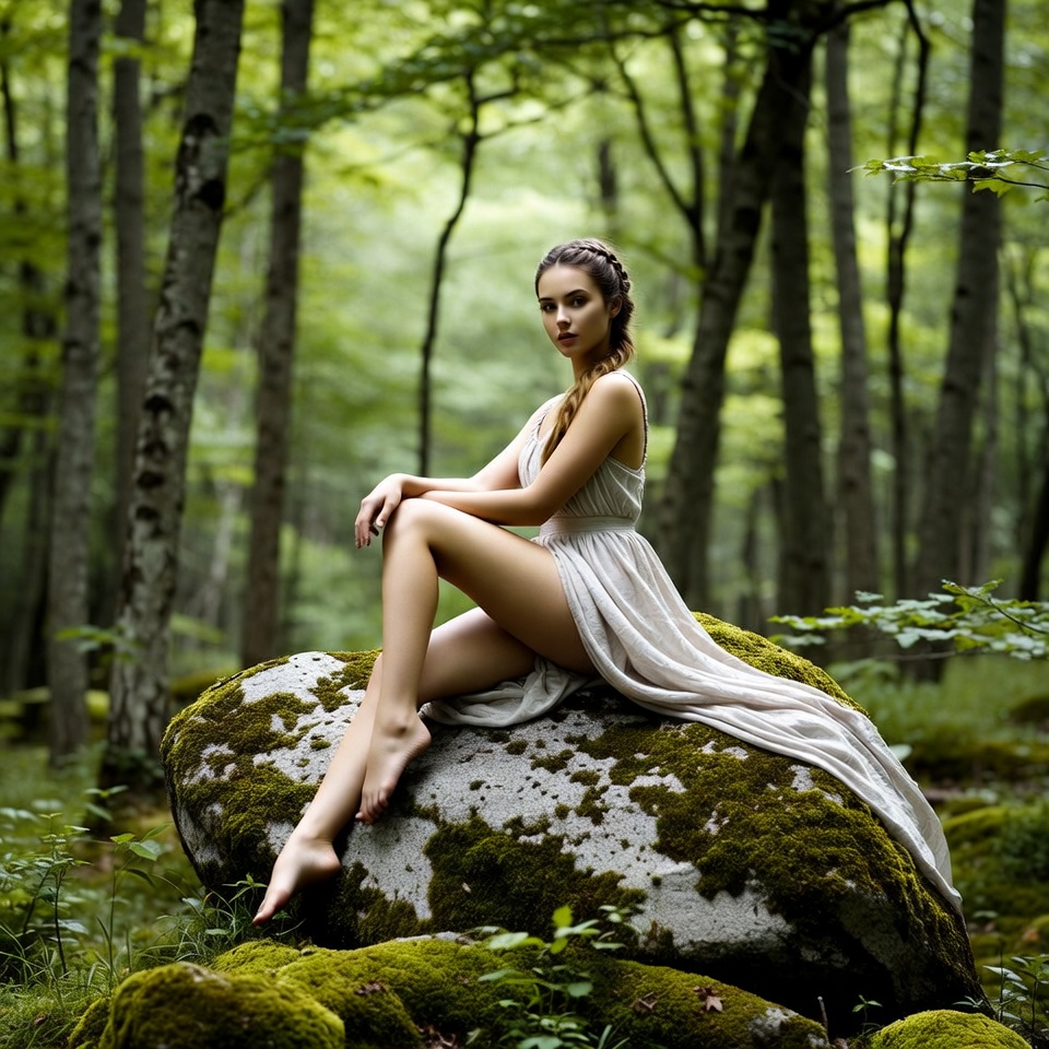 A young woman with brunette hair in braids sits on a large mossy rock in a lush green forest. She wears a flowing white spaghetti-strap dress that drapes over her legs and bare feet. She poses confidently with one hand on her knee amid the surrounding trees and foliage.